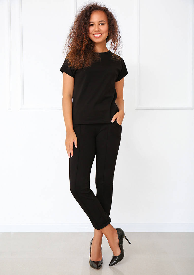 Оригинальности стильному женскому комплекту придают стрелки, которые расположены спереди на штанинах. Эта деталь визуально удлиняет и стройнит ножки.