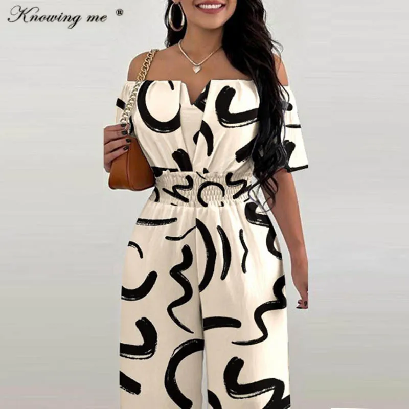 Летний сексуальный комбинезон с открытыми плечами, женский комбинезон с принтом и короткими рукавами, эластичный комбинезон с высокой талией и широкими штанинами, комплект боди
