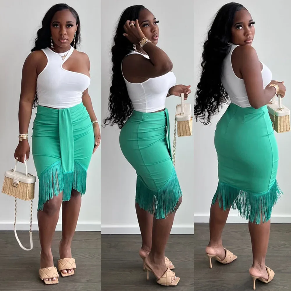 Летний сексуальный облегающий комплект из двух предметов, женский модный Асимметричный жилет, юбка с бахромой, костюм из двух предметов для женщин