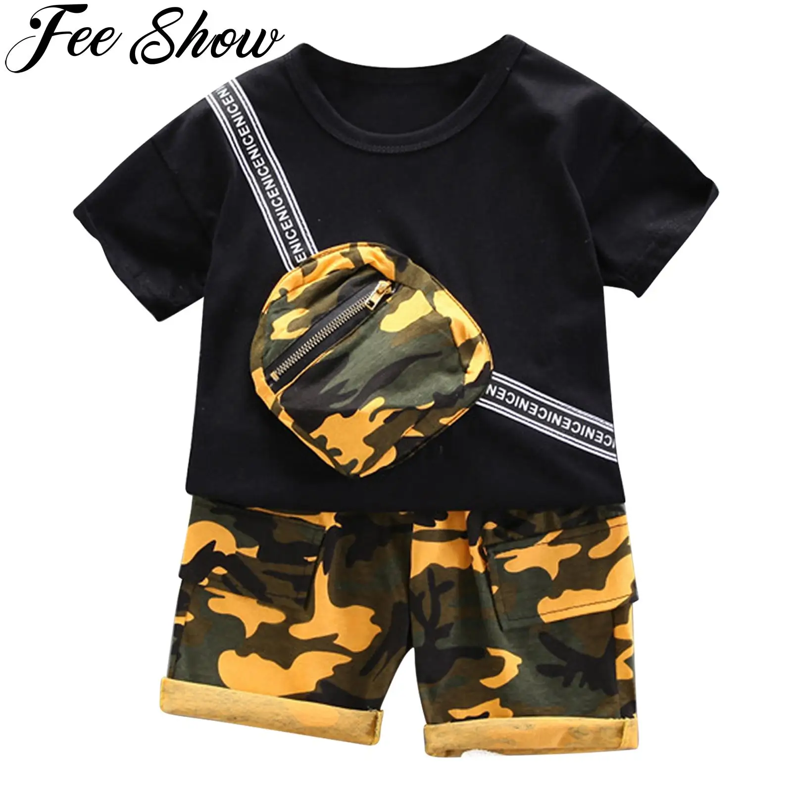 Летняя Детская Хлопковая одежда для мальчиков и девочек, футболка, камуфляжные шорты, одежда для малышей, детские спортивные костюмы, повсе...