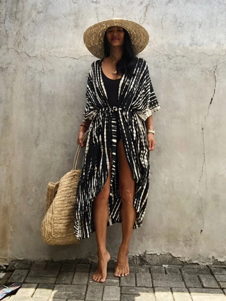 Летняя Пляжная накидка, винтажный Печатный женский купальник, длинный кардиган, Повседневная Свободная пляжная одежда, наряды, купальник, накидки, Халат