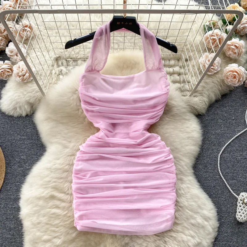 Летняя вешалка для шеи, сетчатая плиссированная короткая юбка с открытой спиной и открытыми бедрами