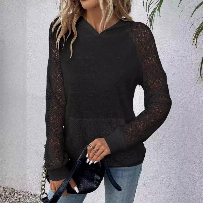 Летняя женская кружевная вафельная клетчатая толстовка с капюшоном в стиле пэчворк Повседневная толстовка Толстовки и свитшоты женские XXL чёрный