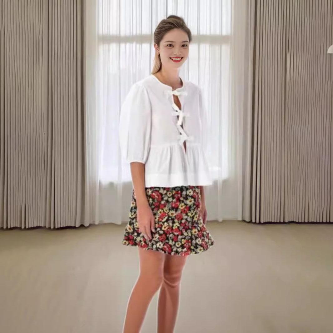 Летняя женская модная повседневная рубашка с полыми кружевными рукавами и принтом
