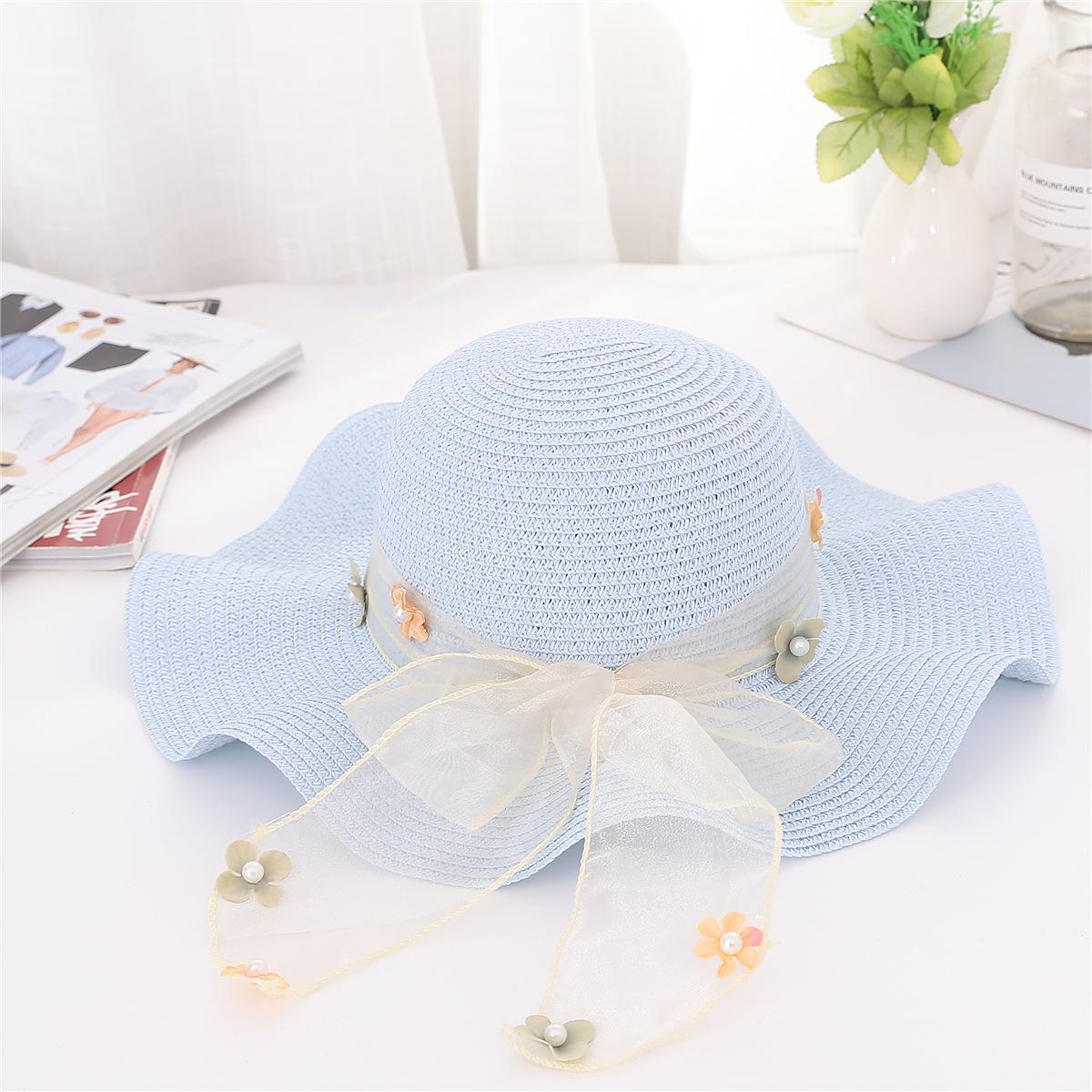 Летняя женская новая солнцезащитная шляпа с бантом и большими полями, волнистая травяная шляпа, пляжная шляпа с цветочным жемчугом, складная average size светло-синий