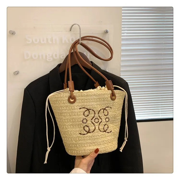 Летняя женская тканая сумка через плечо с алфавитом 2025, кошелек через плечо с открытым плетением из травы и принтом, богемная пляжная сумка одного размера
