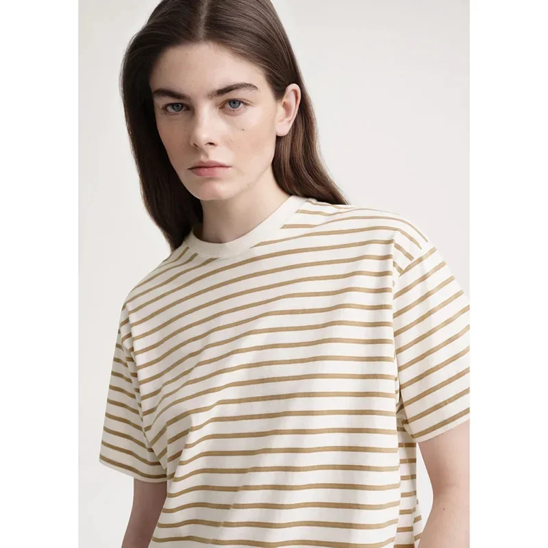 Летняя женская футболка в полоску из чистого хлопка с круглым вырезом и коротким рукавом