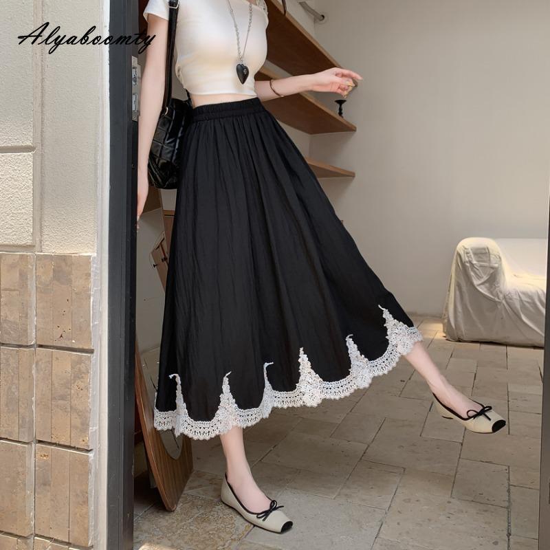 Летняя женская юбка-миди принцессы с высокой талией, белая, черная, кружевная, пэчворк, ажурная, фея, юбка, элегантная, женственная, милая, женская юбка One Size чёрный