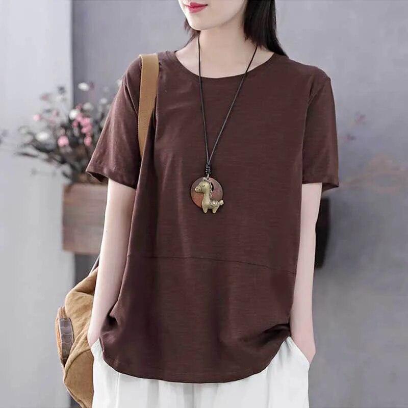 Летняя корейская большая женская одежда, футболка с короткими рукавами и круглым вырезом, свободные универсальные однотонные винтажные топы XXXXL кофейный