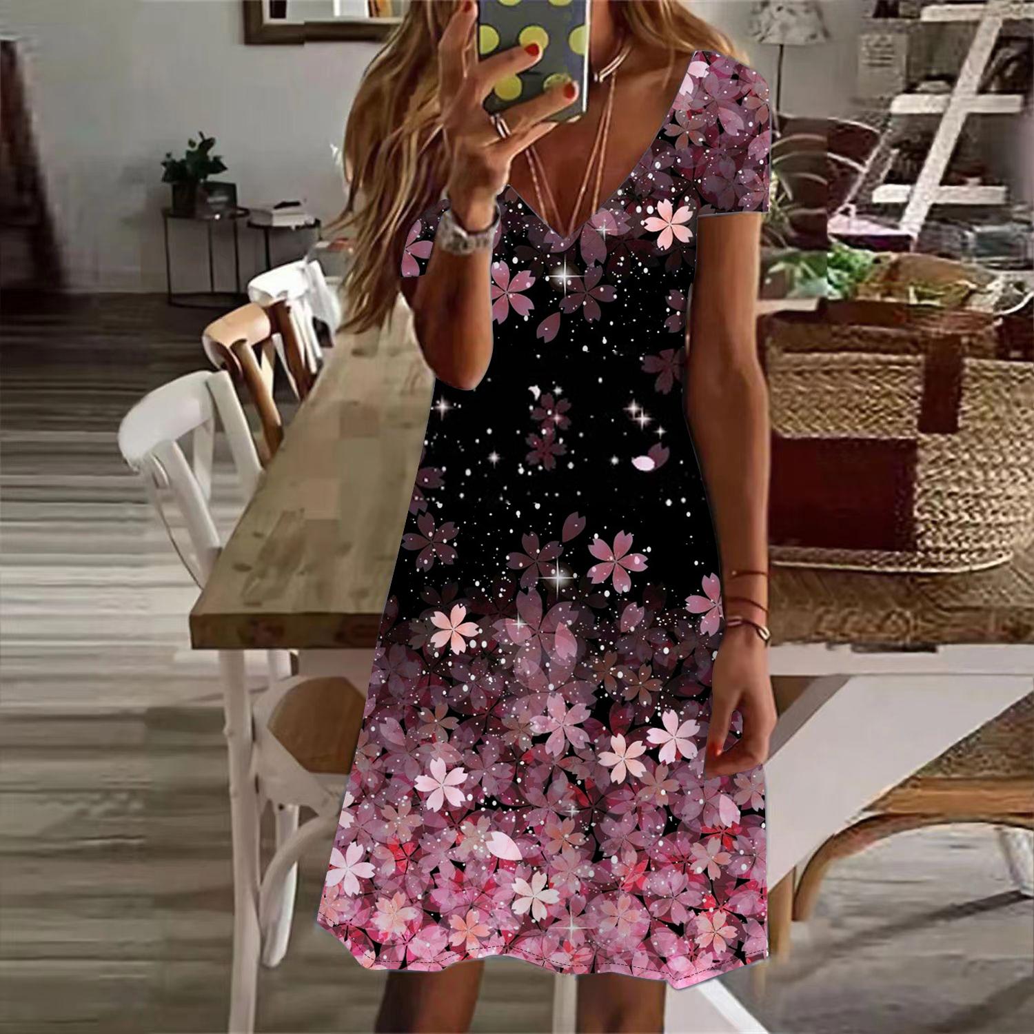 Летняя мода женское платье с V-образным вырезом и коротким рукавом, синее платье с цветочным принтом, сексуальное платье 8XL розовый