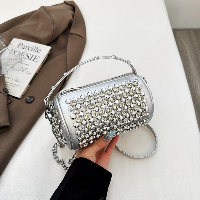 Летняя нишевая цилиндрическая портативная женская сумка новая модная сумка-подушка с заклепками и бриллиантами цепочка на одно плечо сумка-мессенджер серебряный