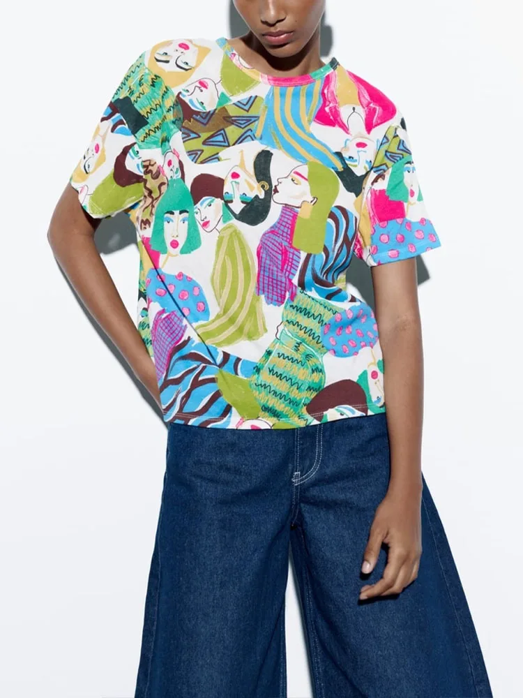 Летняя новая женская нишевая свободная универсальная уличная футболка Ruili с принтом и круглым вырезом и коротким рукавом