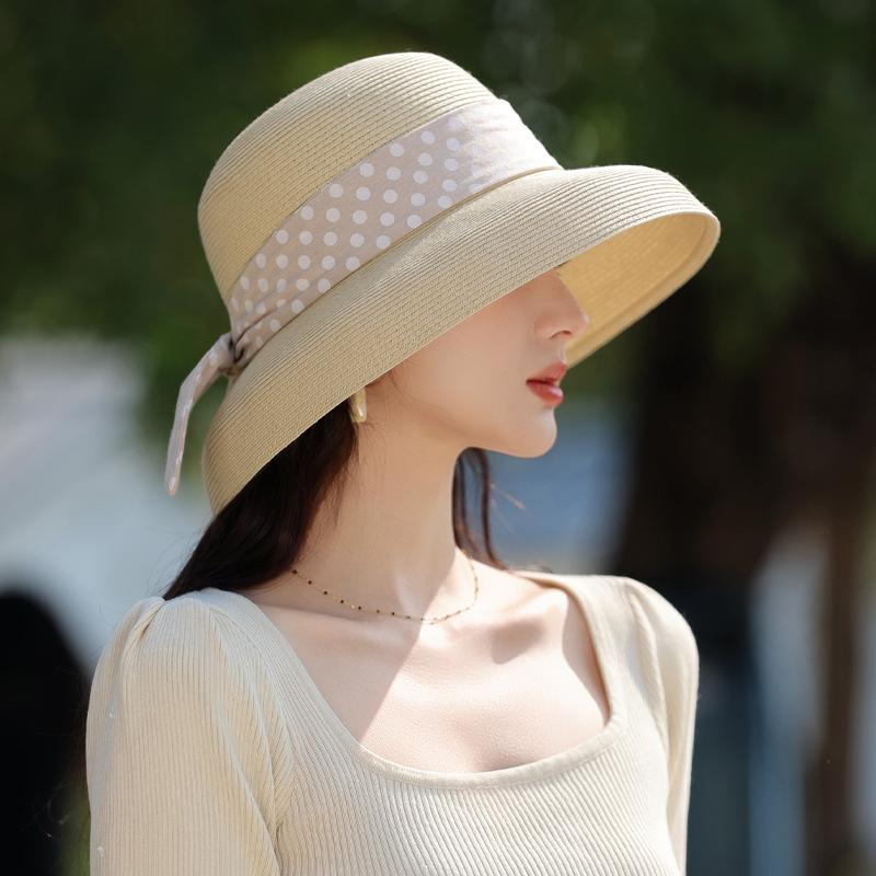Летняя новая шляпа женская в горошек с лентами соломенная шляпа лафит дорожная солнцезащитная шляпа с козырьком average size