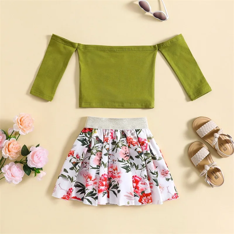 Летняя одежда для девочек 2 шт., топ с открытыми плечами и длинным рукавом + юбка в цветочек, одежда для малышей