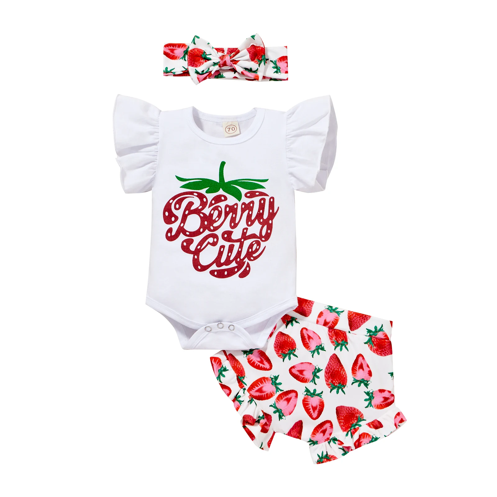 Летняя одежда для маленьких девочек OPPERIAYA, повседневный комплект с буквенным принтом, боди с летающим рукавом, шорты с принтом клубники, повязка на голову с бантом