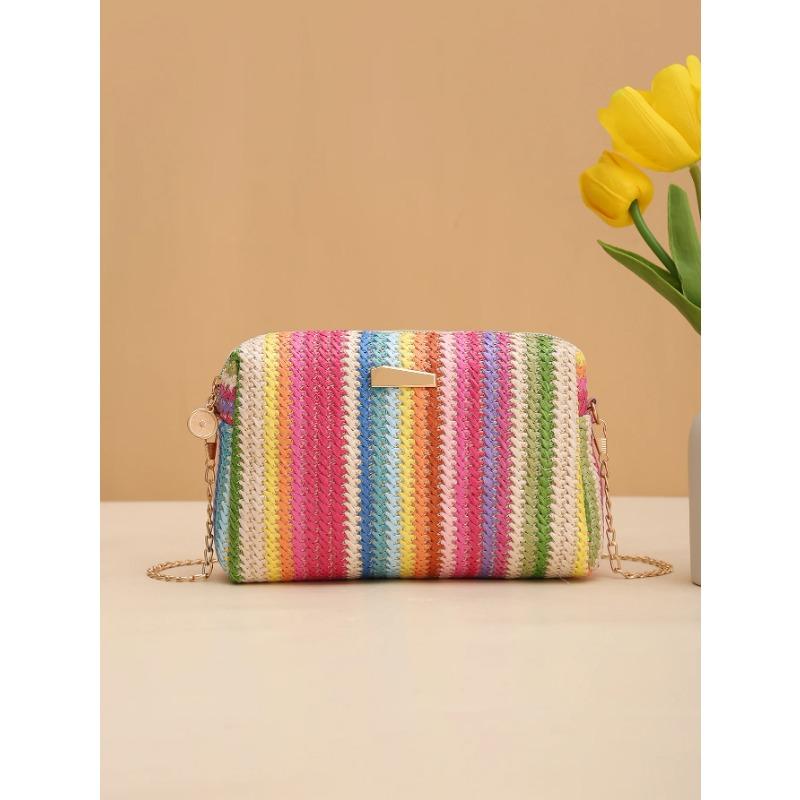 Летняя радужная ротанговая вязаная соломенная сумка через плечо пляжная сумка-кошелек на цепочке женская дорожная сумка-клапан красный