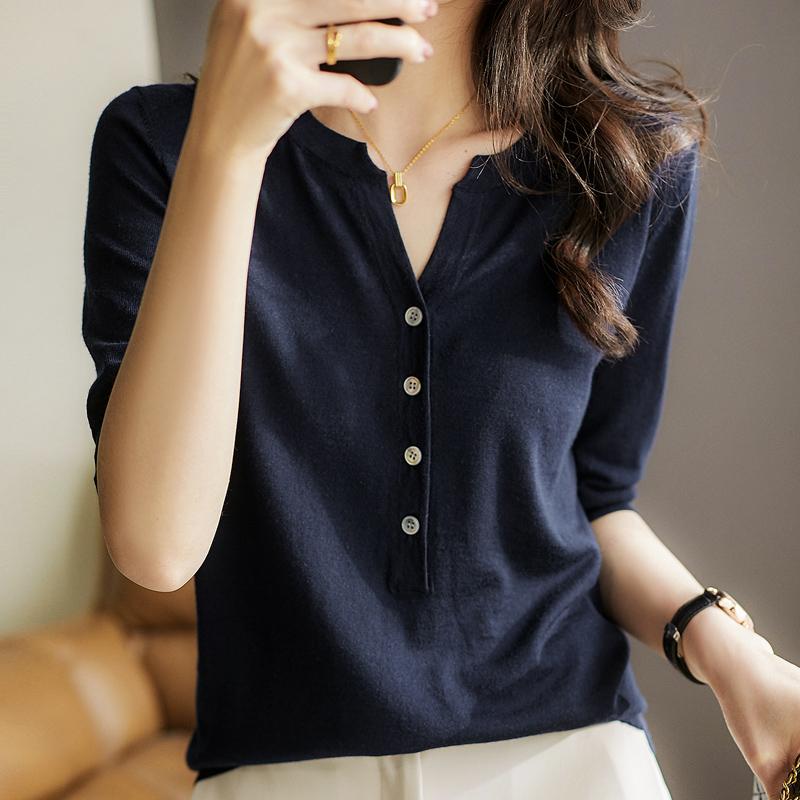 Летняя трикотажная блузка с коротким рукавом и v-образным вырезом, женские топы J246 One Size тёмно-синий