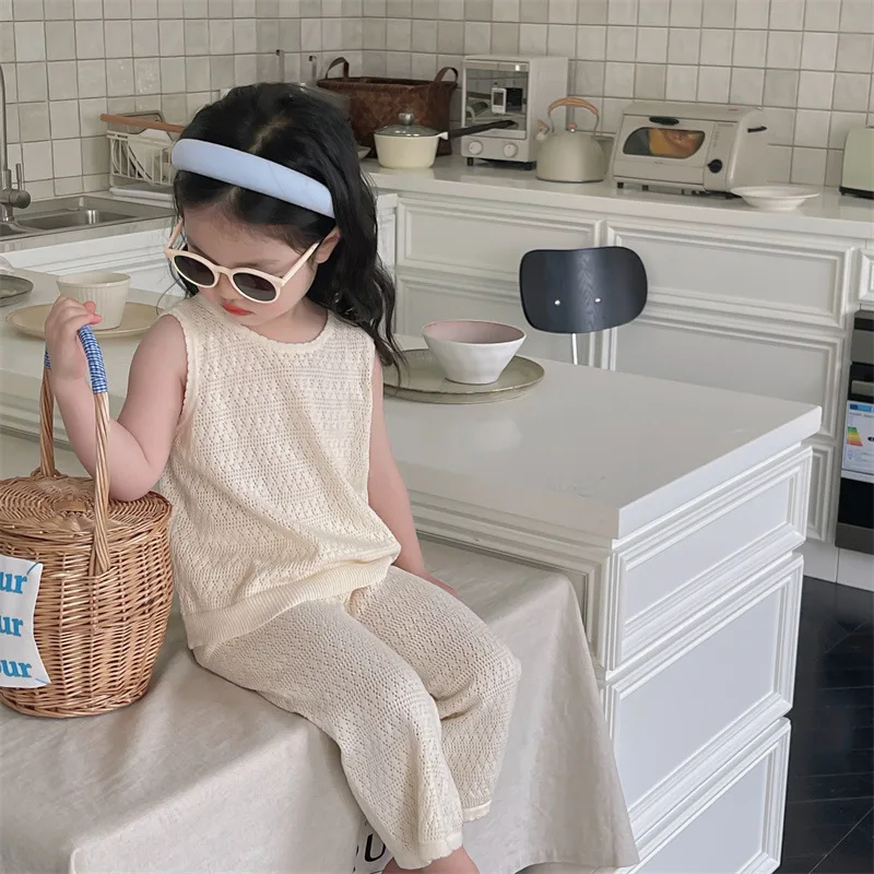 Летняя трикотажная одежда для девочек, комплект из 2 предметов, жилет без рукавов и широкие брюки, одежда для маленьких девочек