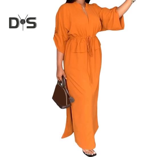Лето-осеннее платье с V-образным вырезом и шнурком. Тонкая талия. Рукава три четверти с разрезом по бокам. Чистый цвет с запонками. Повседневная одежда. Платье макси для свиданий. 2XL оранжевый