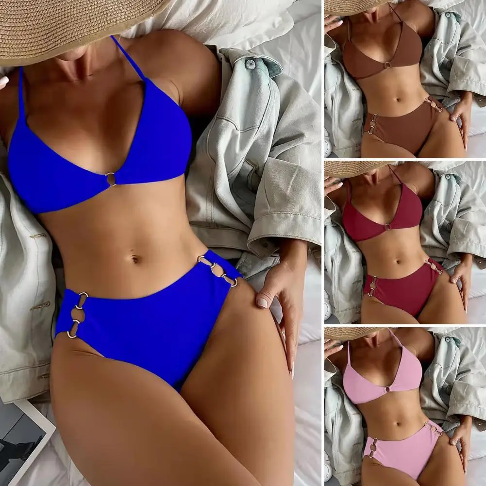 Лидер продаж! Однотонный комплект бикини с металлическими кольцами, Быстросохнущий бюстгальтер с лямками через шею, трусы с высокой талией,...
