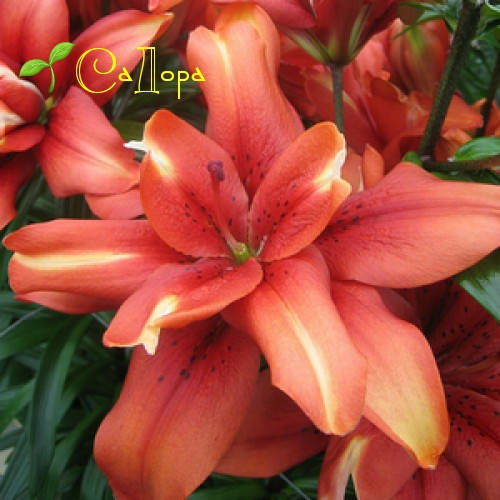 Лилия Коктейль Твинс (Cocktail Twins) с двойным рядом красно-оранжевых лепестков, разделенных по центру молочно-белой полосой, слегка покрыта коричневым крапом, раскиданным по центру цветка. Объемные цветы азиатского махрового гибрида имеют нежный не напрягающий аромат, который позволяет использовать эти цветы в домашнем декоре.