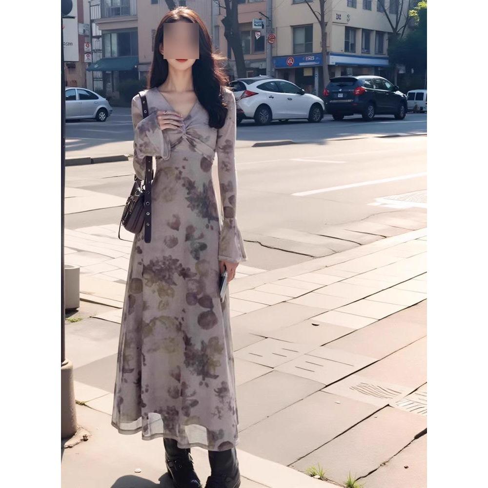 Линь Сяся Осеннее платье А-силуэта приталенного кроя с V-образным вырезом и рукавами-колокольчиками с ретро-принтом Small