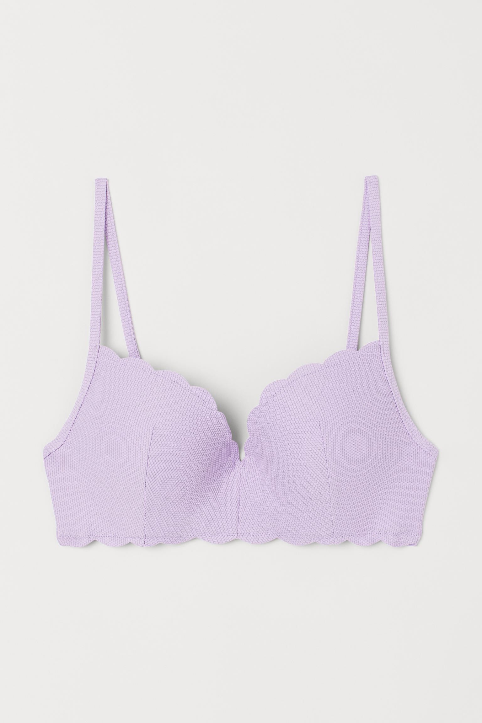 Купальный верх H&M с кружевом. Выполнен из полиамида с добавлением эластана — материал быстро сохнет и прост в уходе. Уплотненные чашки с эффектом пуш-ап приподнимают бюст и придают форму. Мягкая подкладка из полиэстера предотвращает натирание. Благодаря узким регулируемым бретелям можно подогнать размер под индивидуальные особенности фигуры. Застегивается на металлический крючок. Край изделия обработан фестонами — выступами зубчатой каймы. Подходит для отдыха на морском побережье, посещения бассейнов и пляжных вечеринок.