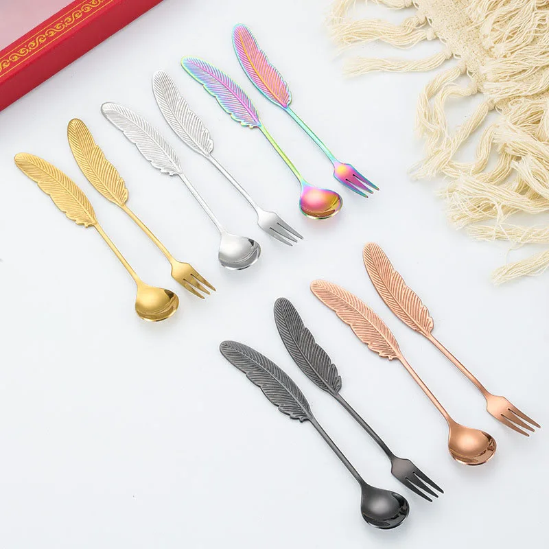 Ложка-вилка из нержавеющей стали с перьями, ложка для десерта, мороженого, фруктов, столовые ложки, кухонные аксессуары для перемешивания ко...