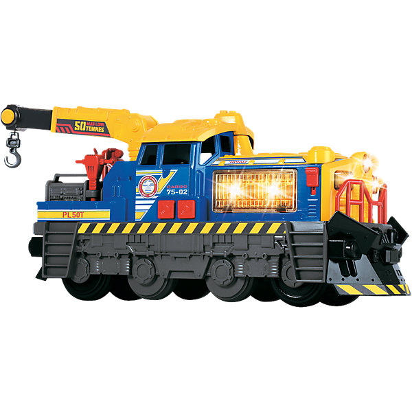 Локомотив Dickie Toys — увлекательная игрушка для мальчиков. У локомотива поднимается и опускается стрела. Вращающийся подъемный кран оснащен крюком с тросом. Крюк опускается и поднимается нажатием кнопки.