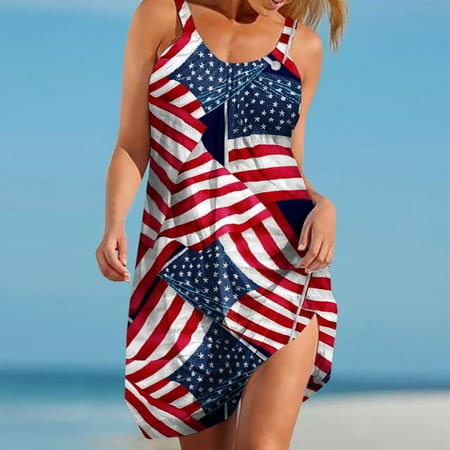 Hvyesh Women s Independence Day Dresses Summer Casual Midi Dress Loose Fit Graphic Crewneck Sundresses Lightweight Spaghetti Strap Sleeveless Soft Dresses 2023 Blue