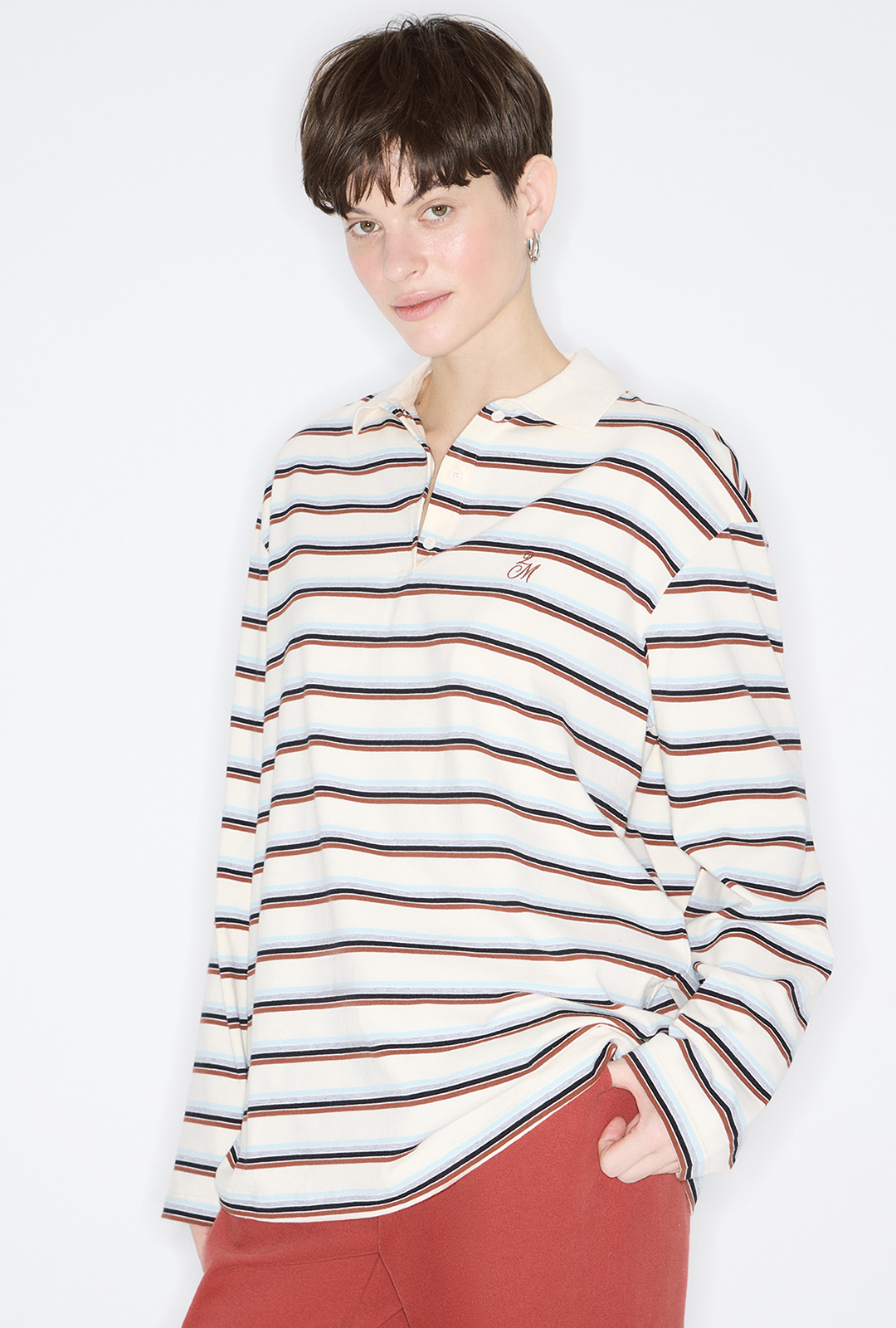 Новый фит поло в полоску с длинным рукавом в винтажном стиле. Выполнено из 100% хлопка высокого качества. Умеренно свободный силуэт подойдет для самых разных образов. На груди деликатная вышивка, отсылающая к названию капсулы 2MOOD CLUB. Носите с шортами или брюками из капсулы, а также сочетайте с денимом.