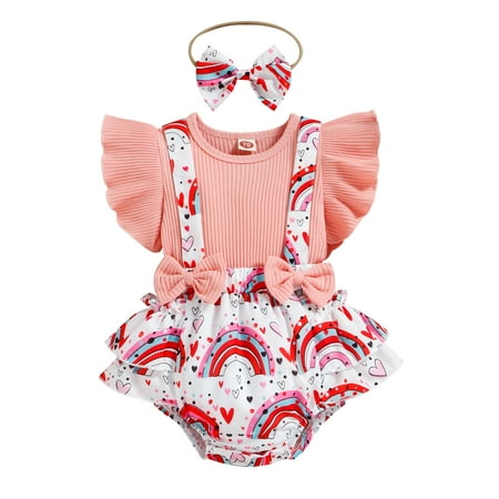 jaweiw Infant Baby Girls Summer Romper Cartoon Flower/Rainbow Printed Fly Sleeve Patchwork Bodysuit+Headband 6-24M