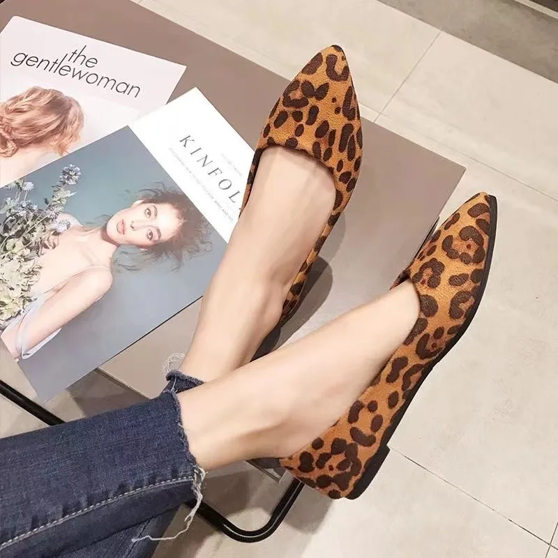 Лоферы женские с острым носком, туфли на плоской подошве, без застежки, леопардовые, большие размеры 34-43, на весну