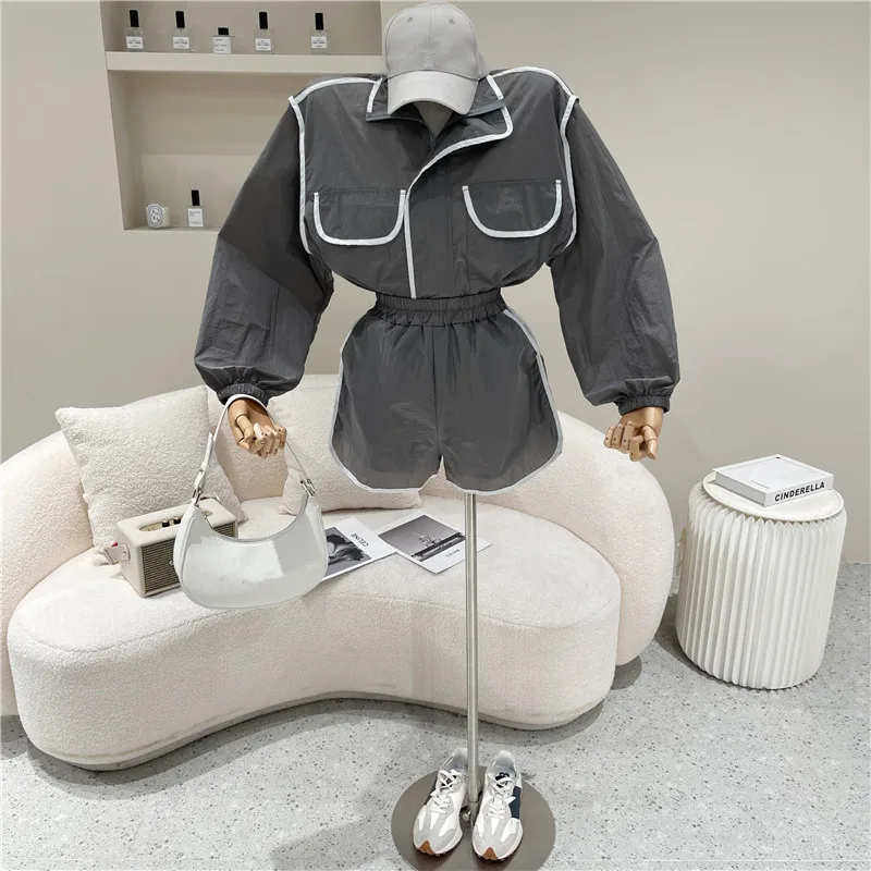 Women's Spring Summer 2021 Niche Design Fashion Long Sleeve Thin Sunscreen Jacket + High Waist Wide Leg Shorts