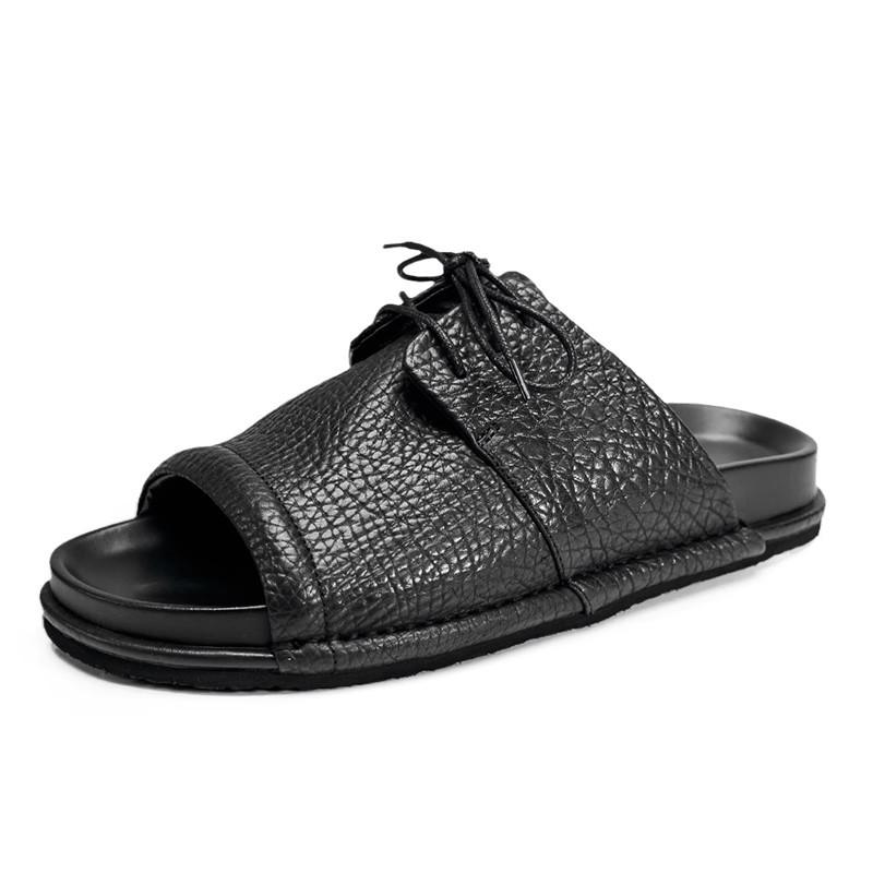 Лучшие роскошные мужские тапочки из натуральной кожи, удобные, прохладные, лето 2024, популярные, новые, мужские пляжные сандалии из мягкой кожи, черные 6 чёрный