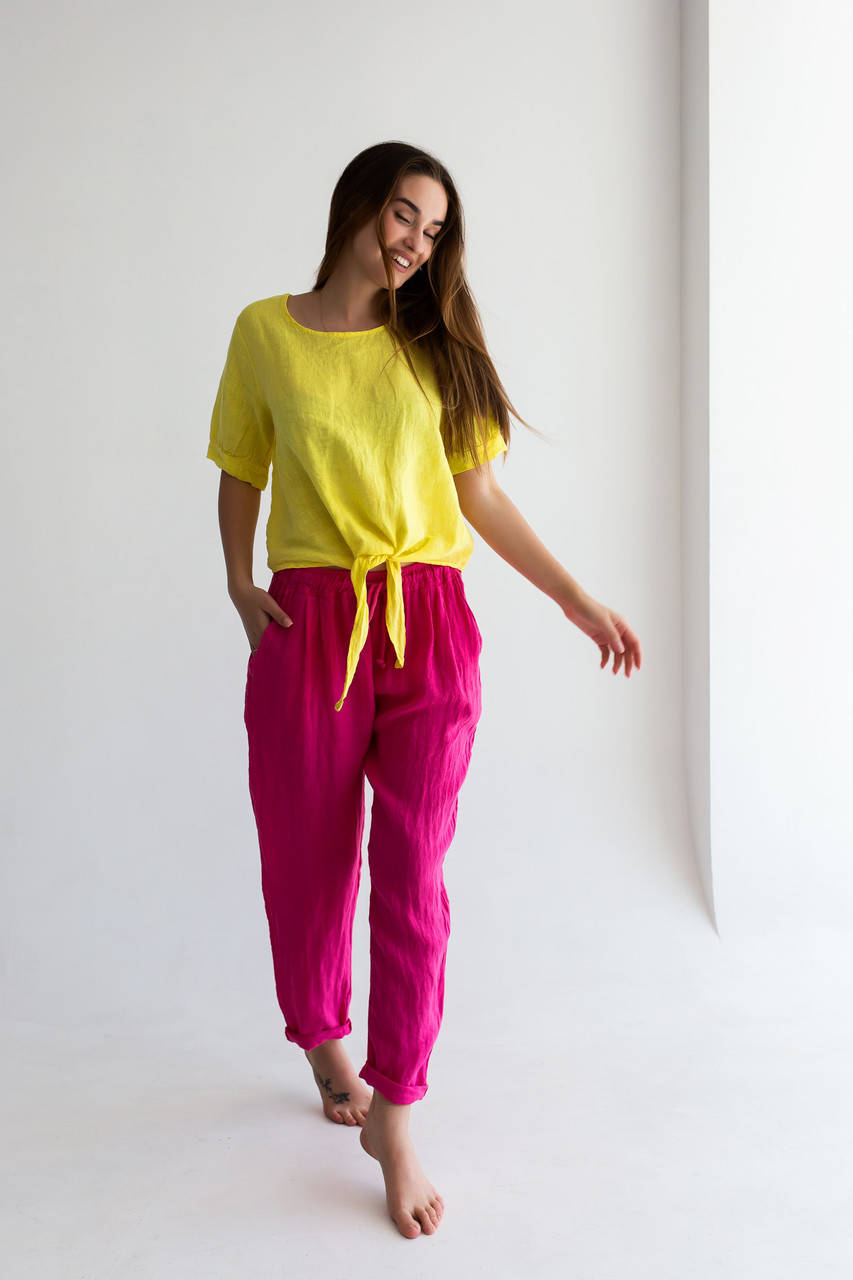 Свободные брюки из натурального льна красивого яркого цвета малины.