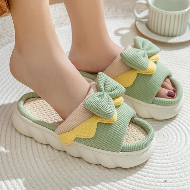 Льняные женские тапочки на платформе с бантом, домашние хлопковые льняные шлепанцы, новые летние уличные нескользящие женские туфли для отдыха