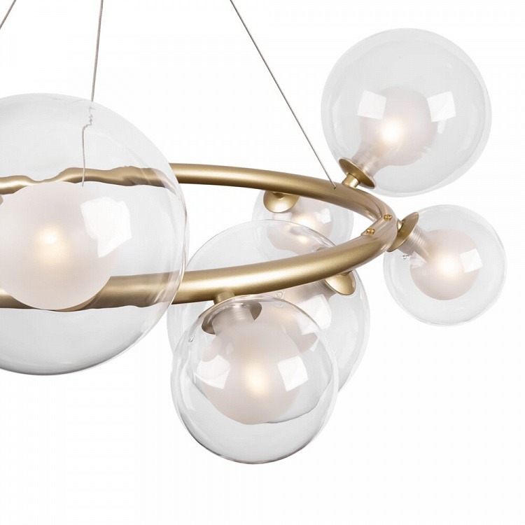 Предназначена для декоративного, интерьерного и общего освещения различных помещений. Арматура оттенка матового золота выполнена из металла, а двойные плафоны-сферы – из стекла. Внутренняя часть плафона – белого цвета, внешняя – прозрачная. Расположенные вдоль широкой окружности, они обеспечивают равномерное, яркое освещение. Визуальную легкость композиции подчеркивают тонкие, почти невидимые тросы – создается иллюзия трендового «парящего» света. Две подвесные люстры обеспечивают различную интенсивность подсветки – можно выбрать подходящий вариант (из 10 или 14 плафонов) с учетом размеров помещения. Светильники станут эффектным акцентным элементом обстановки в стиле mid-century modern, постмодерн, ар-деко, эклектика, хай-тек. Лампы в комплект не входят.