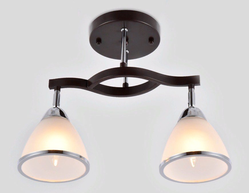 люстра средней высоты, плафон белый (стекло), каркас коричневый/серебристый