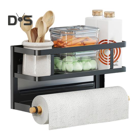 Магнитная стойка для хранения с держателем для бумажных полотенец, большая вместимость, простая установка, полка для специй на холодильник, кухонный органайзер с держателем для рулонов полотенец чёрный