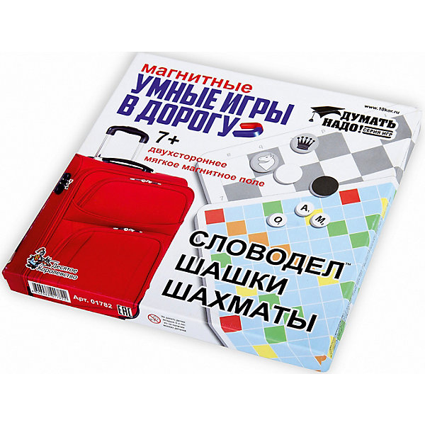 • в наборе: шахматы (игровое поле 22,5х22,5 см, 32 фишки, 1 дополнительная фишка), шашки (24 фишки), «Словодел» (игровое поле, 120 фишек с буквами, 12 дополнительных фишек, 4 магнитных держателя)