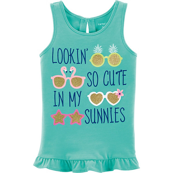 Майка с оборкой по низу. Горловина изделия и проймы для рук отделаны окантовкой. На спинке небольшой вырез и декоративный бантик. Спереди украшена принтом с надписями и блестящими элементами. Натуральная ткань в составе хорошо пропускает воздух.
