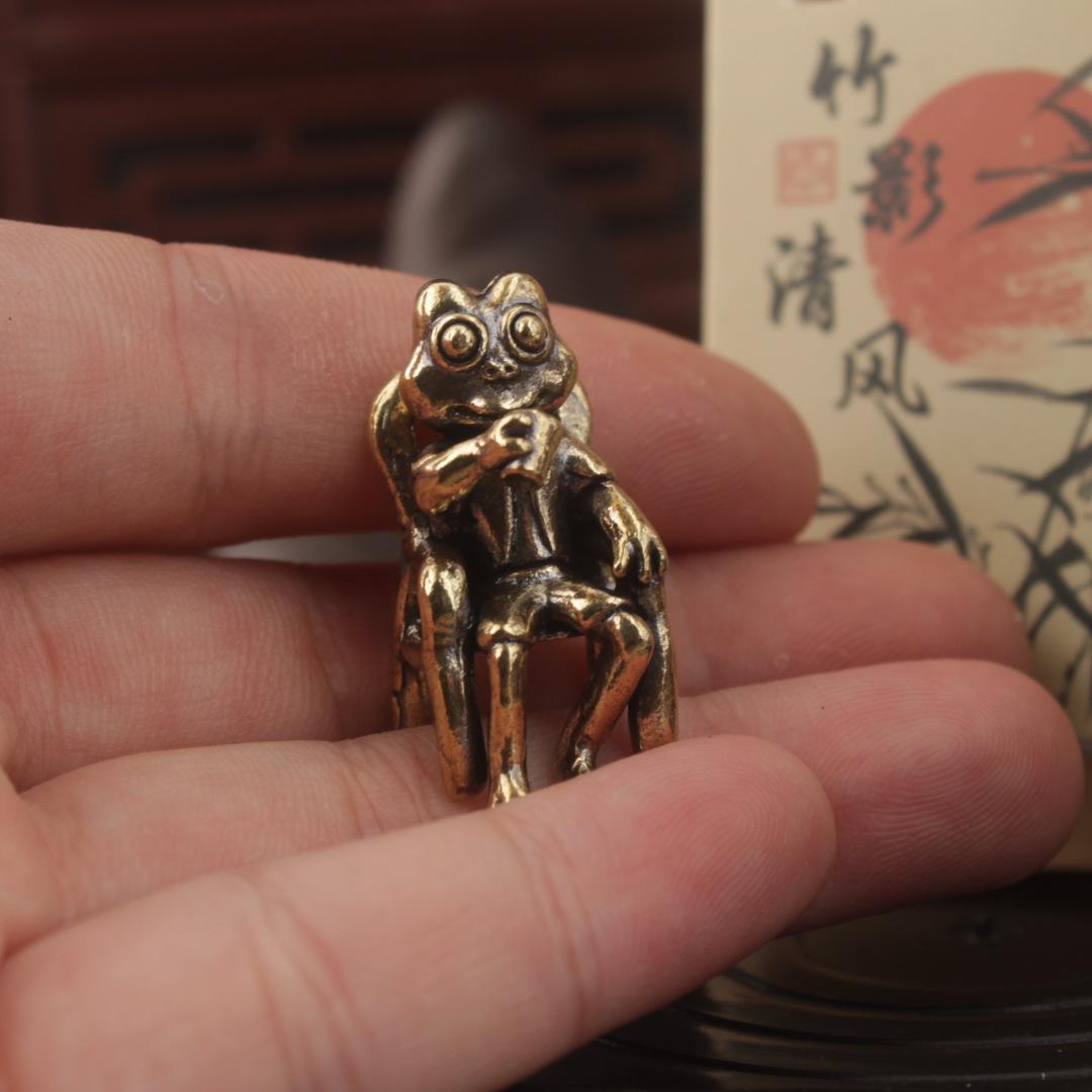 Маленькая фигурка из латуни для офисного стола, мини-лягушка, сидящая на стуле и пьющая чай, украшение для дома, настольный декор, чайный питомец для подарков