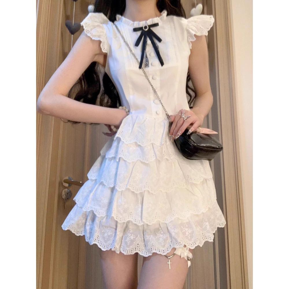 Маленькие рукава-крылышки белое платье женское летнее темпераментное пышное платье-торт с завышенной талией маленькая короткая юбка XL- (recommended 110-60kg)