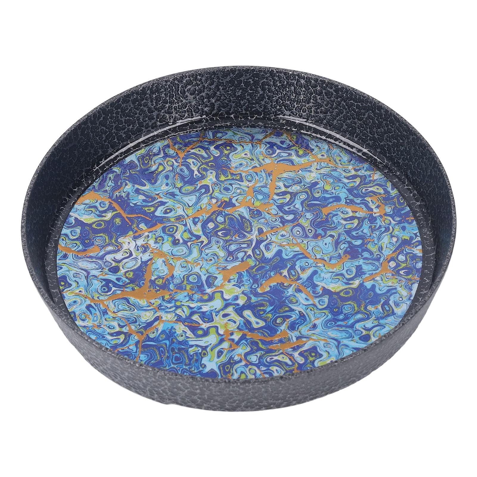Маленький чайный поднос Сложный узор Круглый Сплав Декоративный поднос для подачи чая для дома Патио Веранды Террасы синий