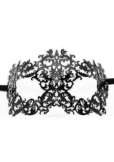 Маска металлическая черного цвета. В венецианском стиле с многочисленными узорами. Украшена стразами. Завязывается на атласные ленты. Длина - 18 см, ширина - 10 см. Упаковка: прозрачный пакет.