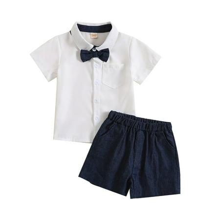 Toddler Little Boys Summer Outfits Summer Short Sleeved White Shirt With Bow Tie Navy Blue Shorts Performance Baby Boys Summer Clothing Sets Size 90 White