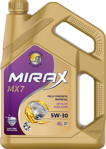 Масло моторное MIRAX синтетическое MX7 5W–30 A3/B4 SL/CF предназначено для обслуживания современных бензиновых и дизельных двигателей легковых автомобилей, а также малой коммерческой техники. Оно изготовлено на основе синтетических базовых масел III группы, надежно защищает детали двигателя от износа, положительно сказывается на расходе топлива и сокращении вредных выбросов в окружающую среду.
