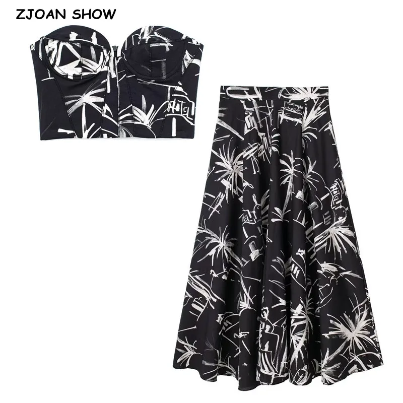 Женский летний комплект из 2 предметов, черный укороченный топ с принтом граффити и длинная юбка макси, а-силуэт и укороченный топ, 2023