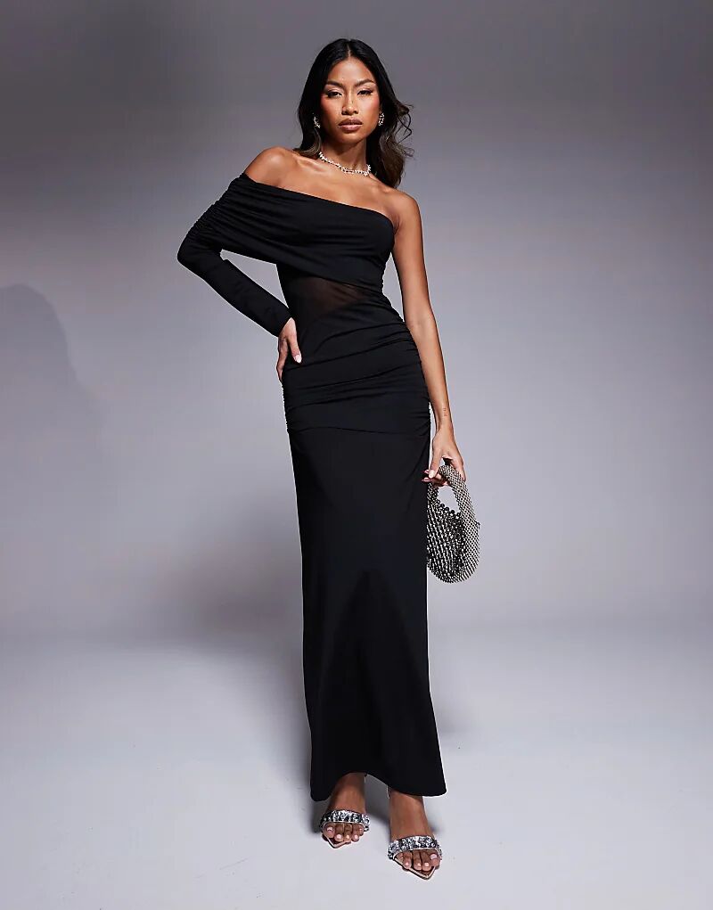 Асимметричное платье макси на одно плечо с сетчатым вырезом черного цвета ASOS DESIGN